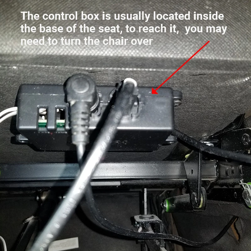 The control box is a black rectangular plastic box. All electronic components are connected to it. It is usually located inside the base of the seat. Usually, you need to turn the chair over to see it from the bottom or the back of your chair.