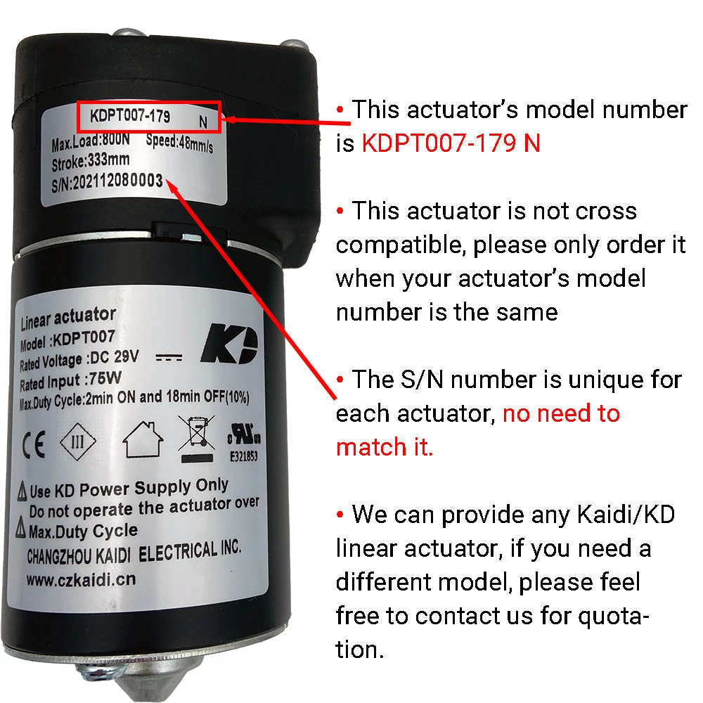 - We can get provide Kaidi/KD linear actuator, if this is not the one you need, please send a picture of the motor label to our email, we will get back to you with a quotation.