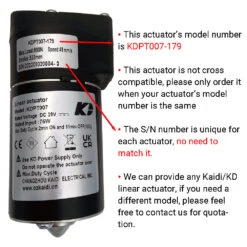 - This is the genuine Kaidi KDPT007-281 linear actuator assembly.