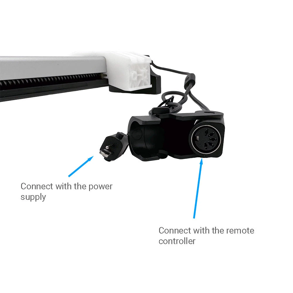 - This actuator has two cables and plugs, the male 2 pin plug connects to the power adapter, the female 5 pin plug connects to the remote controller.